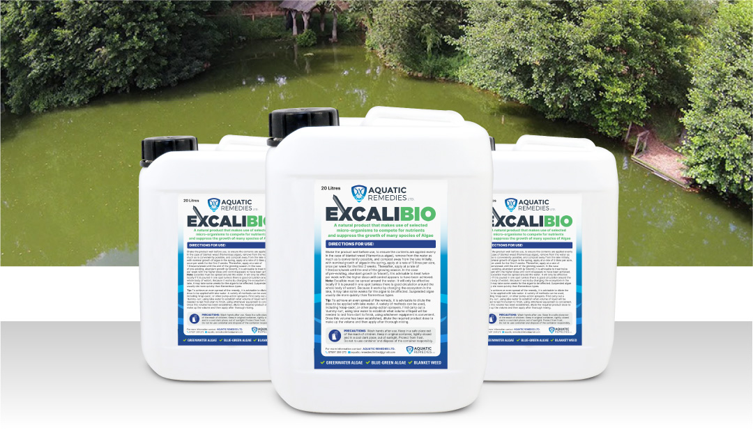 In still waters, problems with algae result from an imbalance in the aquatic ecosystem. Where there are insufficient waterweeds present, algae are the first to ‘grab’ available nutrients when temperature and sunlight increase in the spring. Rapid growth of algae can quickly shade or smother waterweeds, making algae the dominant recyclers of nutrients. If this annual cycle can be broken, waterweeds can re-establish a long-lasting balance. Excalibio works to suppress the growth of algae, by environment-friendly means, by starving it and modifying the water chemistry – simply giving nature a helping hand.